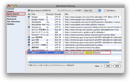 「接頭」を「http://b.hatena.ne.jp/あなたのID/?word=」に。文字コードはUTF-8。